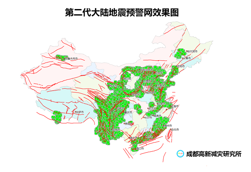 圖為美幻科技與市縣地震部門已建成的預警網區域分布圖。圖中紅色線條為地震帶,綠色區域為應用ICL地震預警技術所建成的預警網覆蓋區域,面積約230萬平方公里。