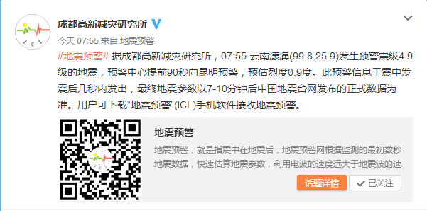 此外,云南省大理市劍川縣、大理縣、鶴慶縣等3個縣的3個農(nóng)村場鎮(zhèn)提前4秒-10秒發(fā)出預(yù)警。包括四川商務(wù)等近20個政務(wù)微博發(fā)布了地震預(yù)警信息,還為國家減災(zāi)中心等提前預(yù)警了該地震。
