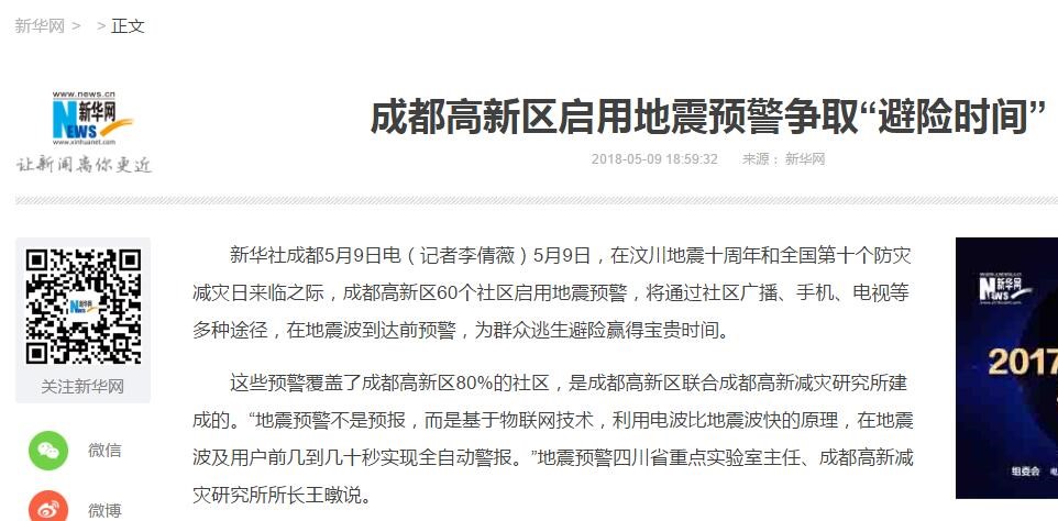 新聞來源:新華網(wǎng) 成都高新區(qū)啟用地震預警爭取“避險時間”