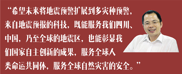 2008年,“5?12”汶川特大地震發生,王暾滿懷家國情懷,毅然回國組建成都高新減災研究所,帶領團隊致力于地震預警技術研發、成果轉化及推廣應用。回國投身地震預警事業,王暾說:國家有難匹夫有責。汶川地震導致了我們國家重大人員死傷,作為一個科技工作者,一個有相關知識背景的學子,當時就決定回國從事地震預警的科技創新工作,一直堅持了十年。