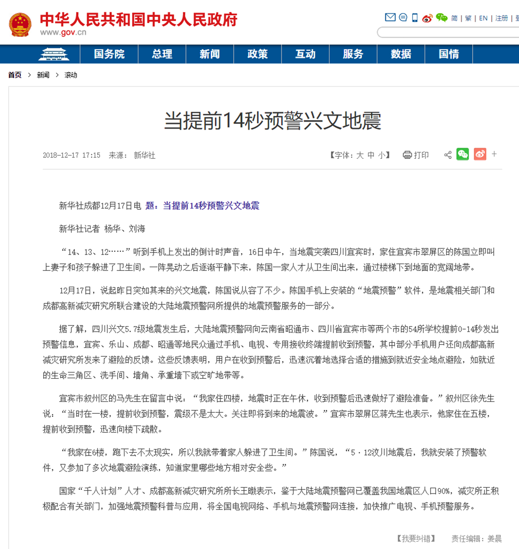 新華社成都12月17日電 題:當提前14秒預警興文地震