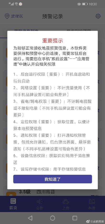 需要特別說明的是,由于目前國內手機廠商的安卓手機系統都有智能的應用設置管理,安裝地震預警APP后,需要用戶手動開啟相關的所有權限(例如,允許后臺運行、開機啟動、不計流量使用、不計耗電、開啟通知權限等),才能夠保障軟件在后臺正常運行。