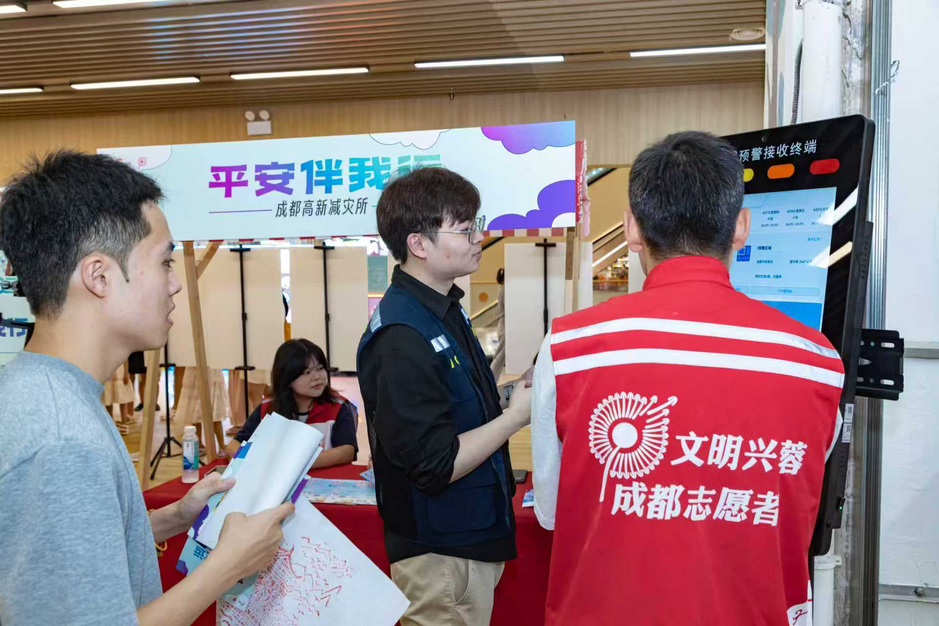 成都市民爭相打卡,參加世運會文化活動。成都高新減災研究所現場設點,幫助市民在互動體驗中掌握緊急避險、自救互救等實用技能。