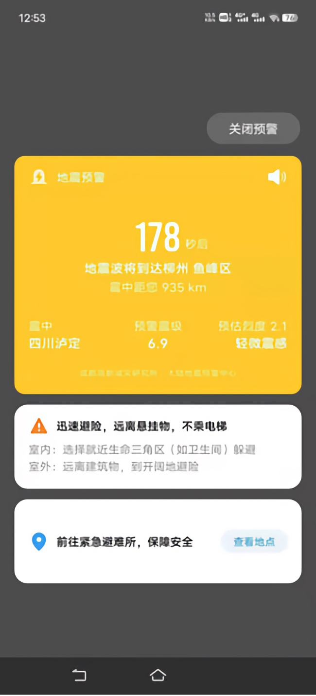 預(yù)警系統(tǒng)在瀘定6.8級(jí)地震發(fā)生時(shí)第5秒發(fā)出預(yù)警,給康定市提前7秒預(yù)警、雅安市提前20秒預(yù)警、成都市提前50秒預(yù)警,四川大量社區(qū)、小區(qū)地震預(yù)警大喇叭提前發(fā)出預(yù)警,千萬民眾的電視、手機(jī)發(fā)出預(yù)警,疫情防控工作人員、居民聽到預(yù)警后緊急避險(xiǎn)。該地震是大陸地震預(yù)警網(wǎng)自2011年連續(xù)成功預(yù)警的第73次破壞性地震。