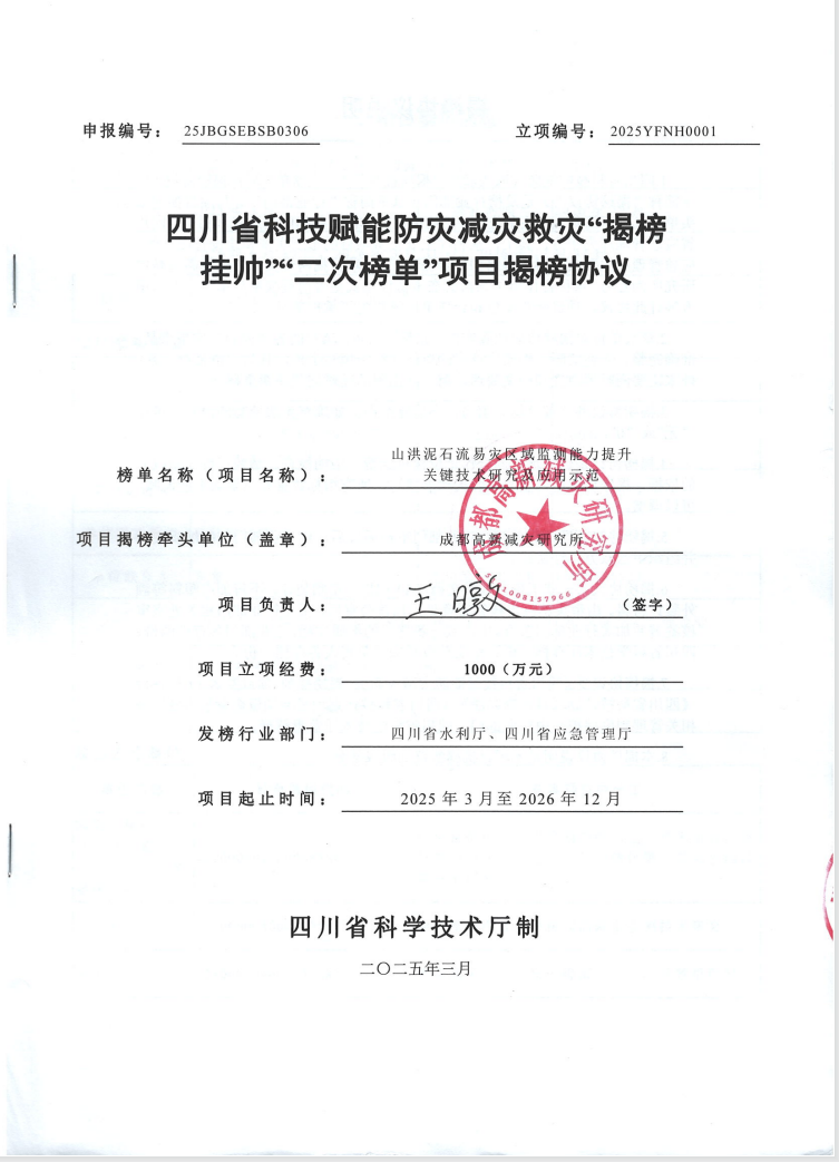 2025年1月,減災(zāi)所牽頭中榜一項四川省政府“揭榜掛帥”災(zāi)害預(yù)警項目:山洪泥石流易災(zāi)區(qū)域監(jiān)測能力提升 關(guān)鍵技術(shù)研究及應(yīng)用示范,此項目由北京大學(xué)、國家氣象中心、南京大學(xué)、電子科技大學(xué)、中科院山地所、水利部、成都山地災(zāi)害與環(huán)境研究所、國網(wǎng)四川雅安電力(集團(tuán))股份有限公司、成都高新減災(zāi)智匯科技有限責(zé)任公司 等單位共同承擔(dān)。