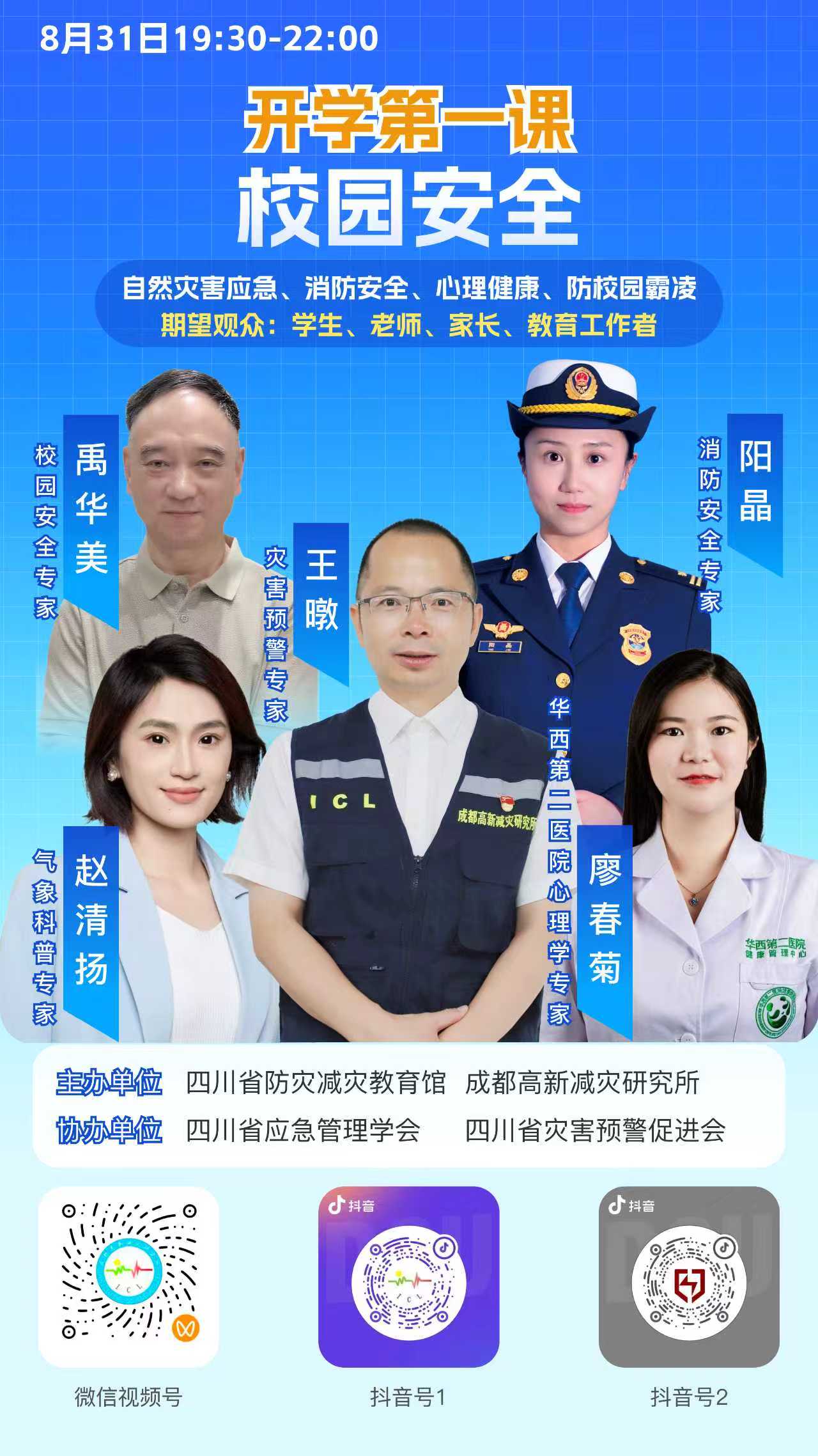 8月31日19:30~22:00,5 位權威專家圍繞自然災害應對、心理健康、消防安全、防霸凌等開展科普講解,不容錯過!